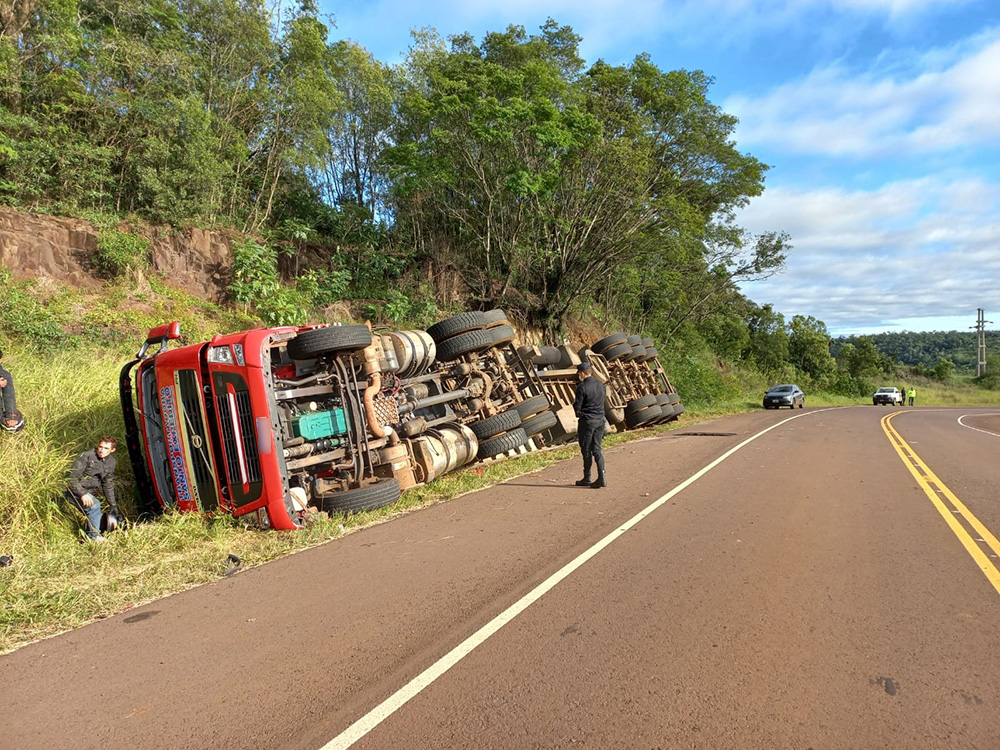 Un camión marca Volvo, al mando de un ciudadano brasileño de 33 años, circulaba esta mañana por la Ruta Provincial 17, transportando 25 toneladas de pollo en sentido Dos Hermanas-Pozo Azul, cuando, por razones que restan esclarecer, al llegar a la altura del kilómetro 23 de la mencionada arteria perdió el control del rodado, despistando y volcando sobre el lateral derecho del camino.