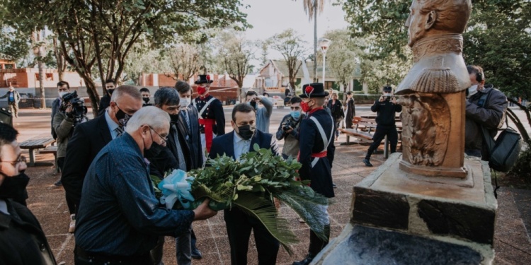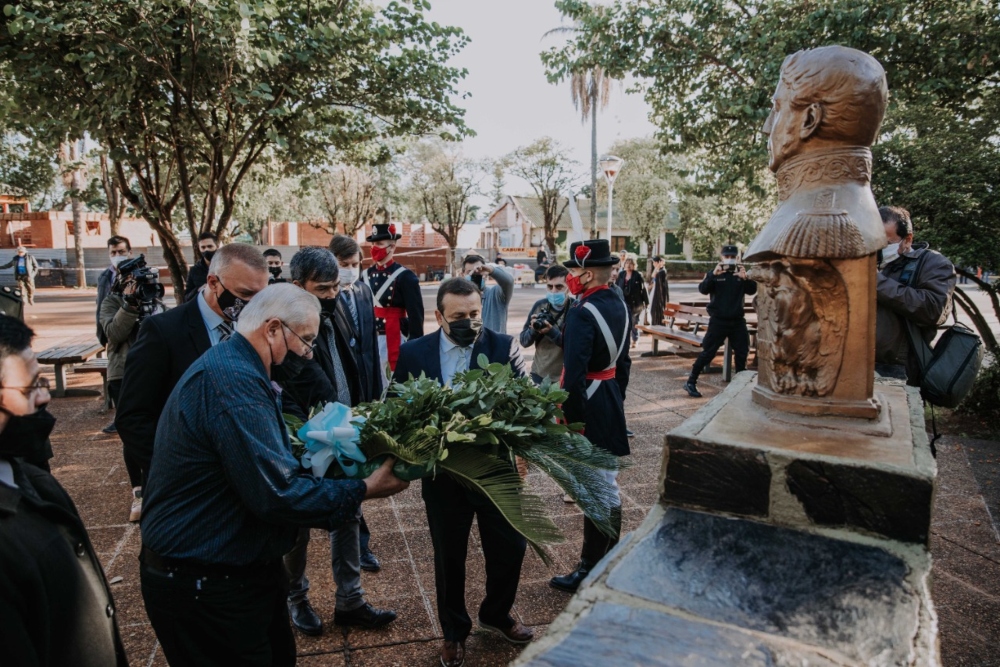El homenaje contó con la participación del vicegobernador, Carlos Arce; el intendente local, Oscar Kornoski; el ministro coordinador de Gabinete, Ricardo Wellbach acompañados por todos los ministros del Poder Ejecutivo; el diputado provincial Martín Cesino junto a sus pares de la Cámara de Representantes, autoridades locales, alcaldes de comunas vecinas, miembros de las Fuerzas de Seguridad tanto nacionales como provinciales y miembros de la comunidad educativa del municipio.