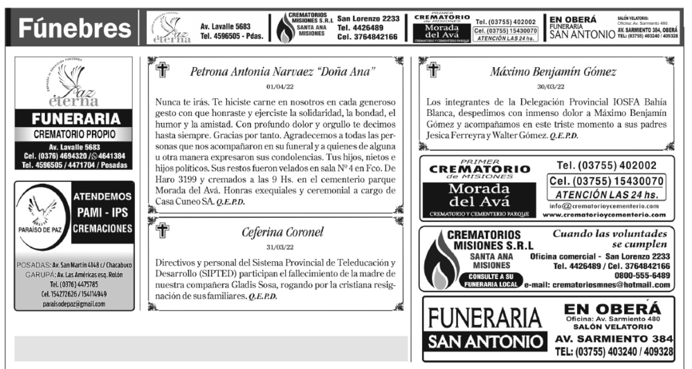 Fúnebres del sábado 2 de abril de 2022