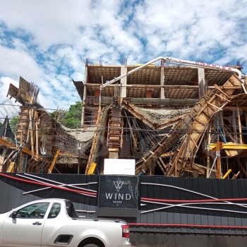 Fueron seis los obreros rescatados de inmediato y trasladados al hospital central con lesiones de diversa gravedad pero mayoritariamente contusiones por la caída desde el encofrado que estaban rellenando con hormigón a quince metros de alto en el emprendimiento “Wind House”.