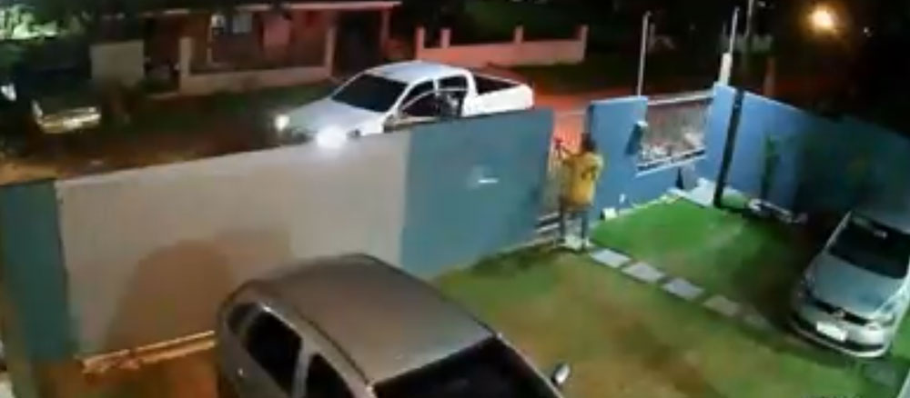 Según las imágenes que registró la cámara de seguridad de la vivienda del detenido, Pimentel primero lo apunta con una pistola en la cara al brasileño y este no se mueve y, mucho menos, abre la reja o portón de acceso.