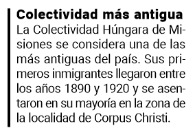 La comunidad húngara misionera, una de la más antiguas del país, está conformada por cerca de 100 familias. A partir del 2017, los miembros de esta colectividad comenzaron a organizar y a llevar adelante distintas actividades artísticas y culturales para difundir sus costumbres y tradiciones que fueron heredando. Fue así que desde el año pasado, esta asociación cuenta con personería jurídica, y participan activamente con otras colectividades de varias provincias y países.
