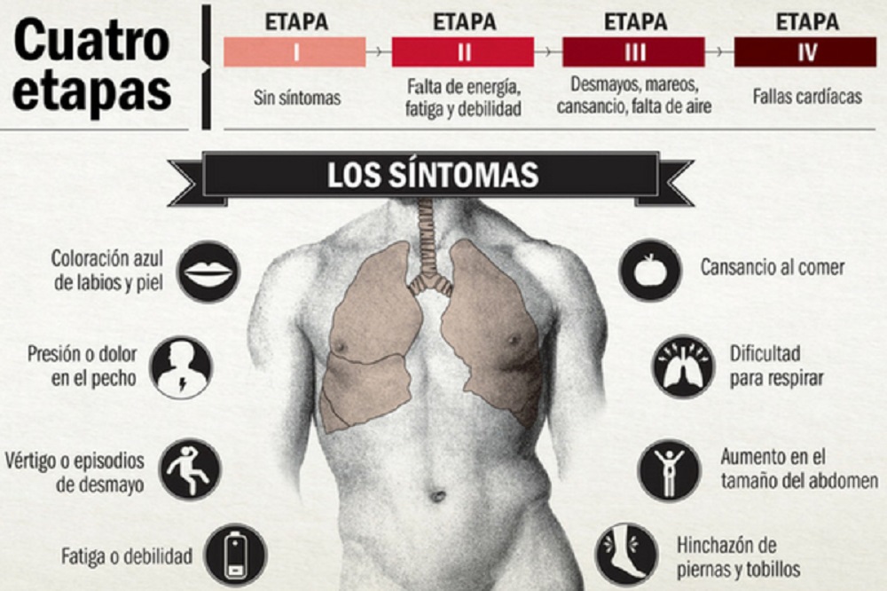 En fases más avanzadas de la enfermedad pueden aparecer signos y síntomas de retención de líquidos como hinchazón o edema en tobillos, acumulación de líquido en el abdomen y empeoramiento de la falta de aire que puede ocurrir incluso durante el reposo.