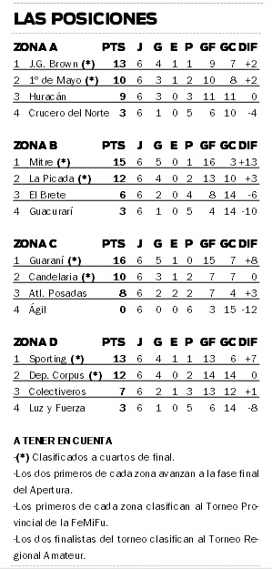 Así las cosas, los cruces de cuartos de final serán los siguientes: Jorge Gibson Brown (1º de la Zona A) vs. La Picada (2º B), Bartolomé Mitre (1º B) vs. 1º de Mayo (2º A), Guaraní Antonio Franco (1º C) vs. Deportivo Corpus (2º D) y Sporting de Santo Pipó (1º D) vs. Candelaria (2º C).