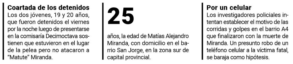 La primera versión que se desprendió de los testigos circunstanciales de los incidentes apuntó a que “Matute” Miranda se transformó en víctima fatal por los golpes que recibió de dos muchachos en medio de un enfrentamiento callejero. Las lesiones supuestas correspondían a patadas, puñetazos y piedrazos, remarcó la dramática hipótesis.