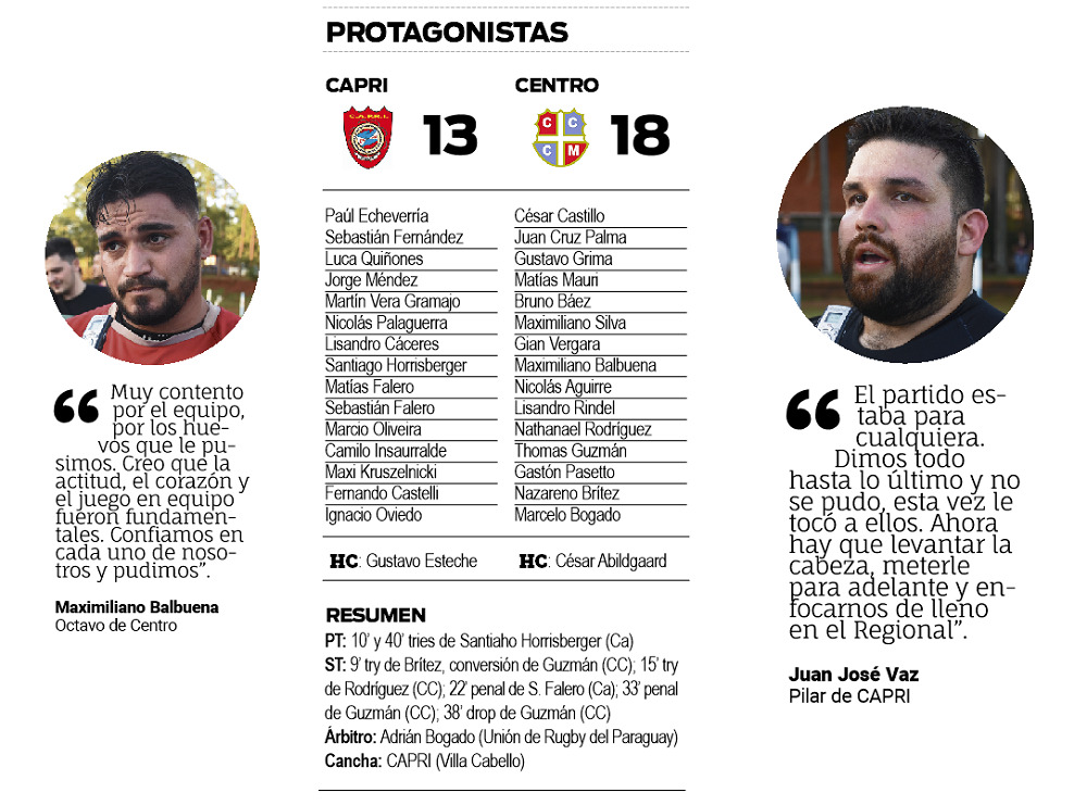 Centro tuvo un penal y lo aprovechó Guzmán para volver a poner arriba a la visita a los 33, y minutos más tarde (38), el mismo “Thomy” Guzmán clavó un exquisito drop para estirar la ventaja a favor del cazador por 18-13, marcador que no se movió más pese a los intentos de CAPRI en los instantes finales.