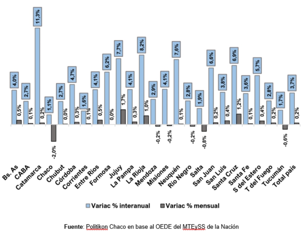 Catamarca se sostiene como líder nacional con una suba del 11,3% (única en alcanzar expansiones de doble dígito), con importante participación de la actividad minera y la construcción. En segundo lugar, quedó La Rioja (+8,2%), de la mano de la construcción; y Jujuy se posiciona tercera (+7,7%) con predominio del empleo industrial.