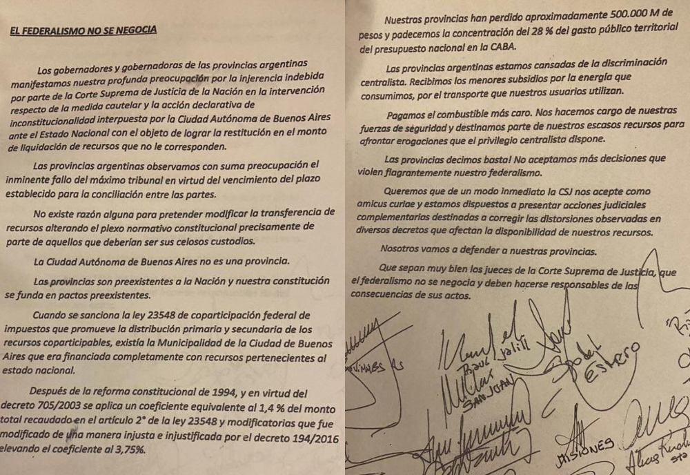 “Los gobernadores y las gobernadoras de las provincias argentinas manifestamos nuestra profunda preocupación por la injerencia indebida por parte de la Corte Suprema de Justicia de la Nación en la intervención respecto de la medida cautelar y la acción declarativa de inconstitucionalidad interpuesta por la Ciudad Autónoma de Buenos Aires ante el Estado Nacional con el objeto de lograr la restitución en el monto de liquidación de recursos que no le corresponden”, es el primer párrafo del escrito titulado “El Federalismo no se negocia”.