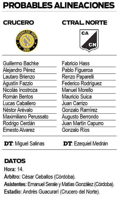 Crucero del Norte buscará esta tarde prolongar su buen momento en el Torneo Federal A, tercera categoría del fútbol argentino, cuando reciba en casa y por la octava fecha del certamen a Central Norte de Salta.