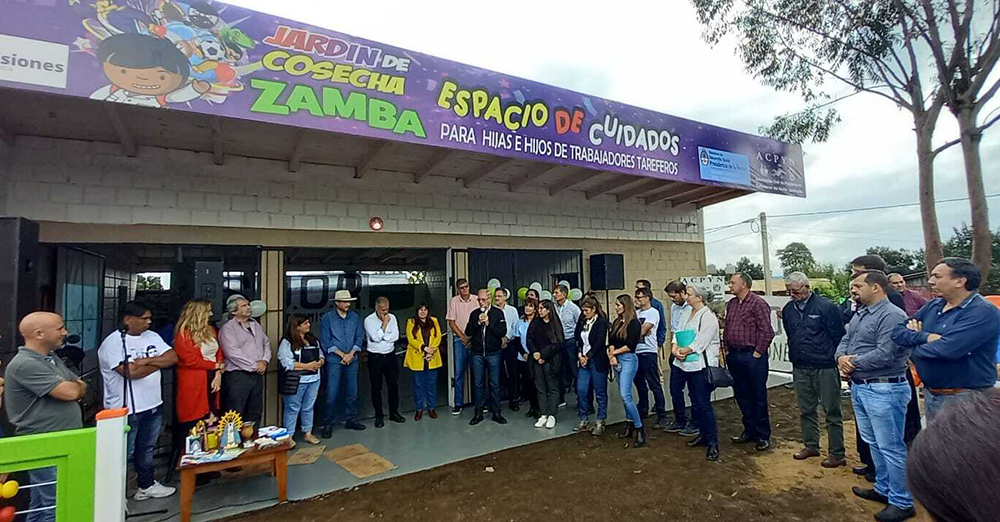 Ayer martes se inauguró el Jardín de Cosecha Zamba en la localidad de Comandante Andresito, a partir de un trabajo conjunto entre la Asociación Civil de Productores Yerbateros del Norte (ACPYN), el Sindicato Único de Obreros Rurales (SUOR), la Federación de Trabajadores Agrarios de la Actividad Primaria (FETAP), y la Secretaría Nacional de Niñez, Adolescencia y Familia (SENAF) del Ministerio de Desarrollo Social de la Nación.