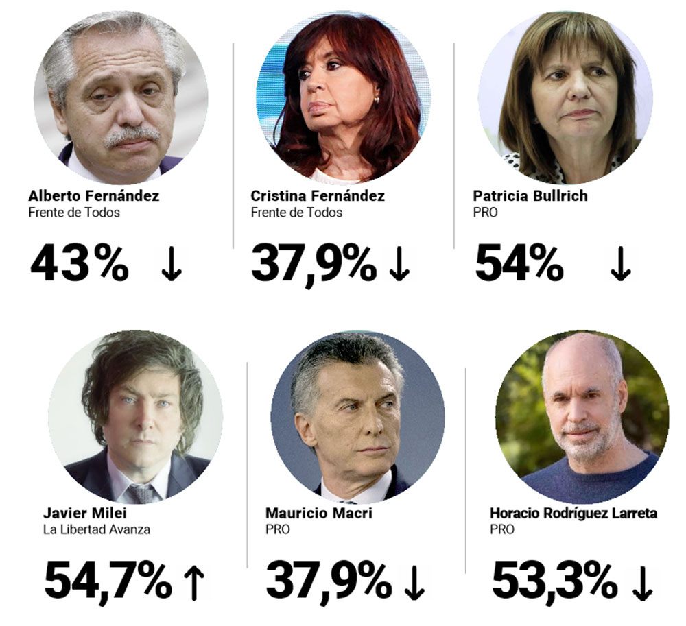 De los resultados, el “libertario” diputado nacional y la exministra del macrismo son los que cuentan con la mejor consideración. Milei obtuvo el 54,7% de imagen positiva (en abril había llegado al 54,2%) con una leve suba mientras que cosechó un 28% de opiniones negativas.