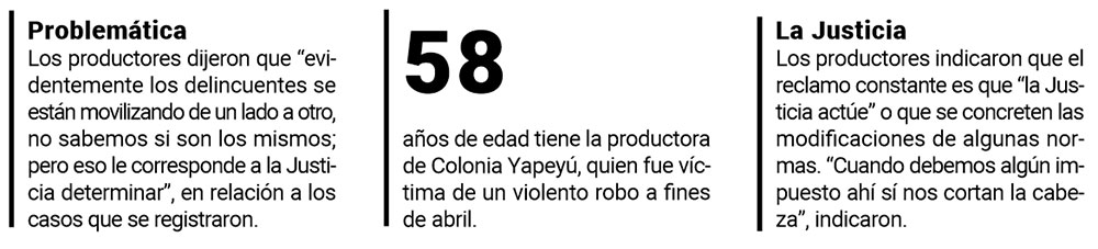 Por un lado, a fines de abril una productora (58) de Colonia Yapeyú, en Guaraní, fue abordada por delincuentes encapuchados y armados en su domicilio y en esa ocasión, los malvivientes se llevaron 15.000 dólares, 7.000 reales, 1.250.000 pesos y una camioneta que fue encontrada a unos diez kilómetros del domicilio de la denunciante.