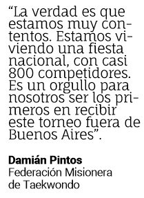 “La verdad es que estamos muy contentos. Estamos viviendo una fiesta nacional, con casi 800 competidores. Muy contentos con el apoyo que nos brindo la Confederación, además de los ministerios de Deportes y Turismo, junto con la Municipalidad de Posadas”, sintetizó ayer a EL DEPOR el presi de la Federación Misionera de Taekwondo WT, Damián Pintos.