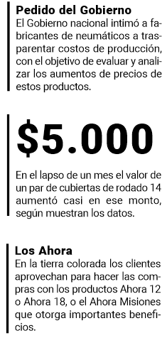 Para describir el impacto de la inflación en el valor de este producto, se puede detallar a modo de ejemplo que a principios de marzo dos cubiertas rodado 14 costaban $34.900, pero en abril el mismo par pasó a valer $39.746; es decir en mes se registró un incremento de casi $5.000. En tanto, una cubierta rodado 16 hasta la semana pasada se conseguía $56.000. Por otro lado, dos cubiertas rodado 15 en agosto del año pasado valían $42.780, pero ahora cada una puede alcanzar los $30 mil según la marca.