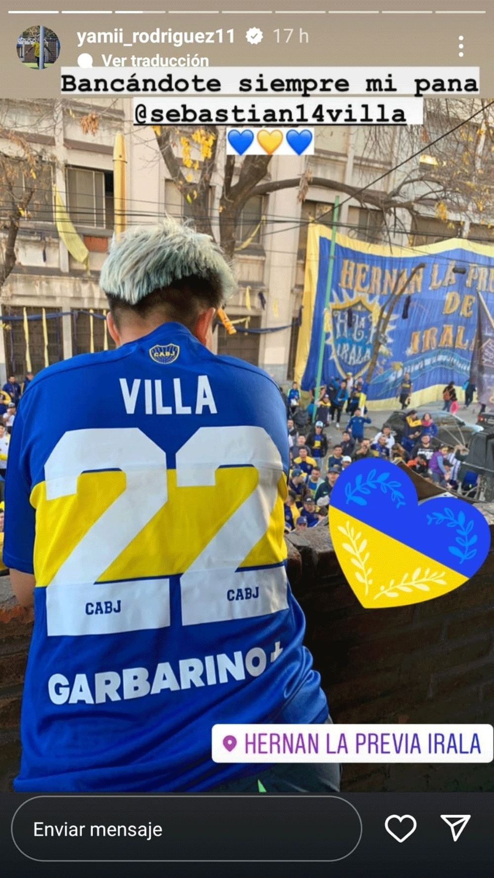 La publicación fue de una foto en la que aparece Yamila Rodríguez de espaldas, en un balcón de la calle Irala, admirando a la gente de Boca en la previa del partido de semifinales de la Copa de la Liga contra Racing, con la camiseta de Villa puesta. Tras recibir comentarios negativos, Rodríguez insistió con su respuesta en Twitter: “Miren el partido y dejen mi foto en paz”.