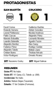 Por la novena fecha del Torneo Federal A, Crucero del Norte tuvo un gran partido ante San Martín de Formosa, con el que igualó 1-1, pero se va con una sensación rara ya que el punto sirve, pero pudo haberlo ganado si el árbitro Bejas no cobraba un penal inexistente para el local.