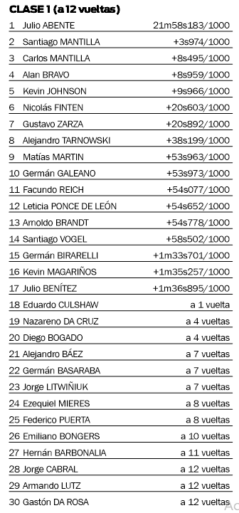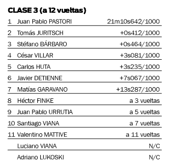 Respecto a la Clase 3, la más tecnológica, el triunfo fue de Juampy Pastori. “Una de las claves fue doblar bien en la nueva variante, es exigente”, sintetizó el ganador. Detrás suyo llegó el obereño Tomás Juritsch, quien resaltó que “en los últimos giros tuvimos más ritmo que Pastori y fuimos a presionarlo, pero también mirando en el espejo a Bárbaro”, en relación al otro obereño, que fue tercero.