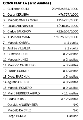 No faltó ayer el show de los fititos. Y en pista el ganador fue Diego Bonda, seguido por Marcelo Da Cruz y Martín Correa Álvez. Sin embargo, el trío fue excluido en la técnica, por lo que todo cambió y Guillermo Guidi se quedó con el triunfo, seguido por el chaqueño Oscar Cervera, quien hizo su primer podio en el automovilismo misionero.