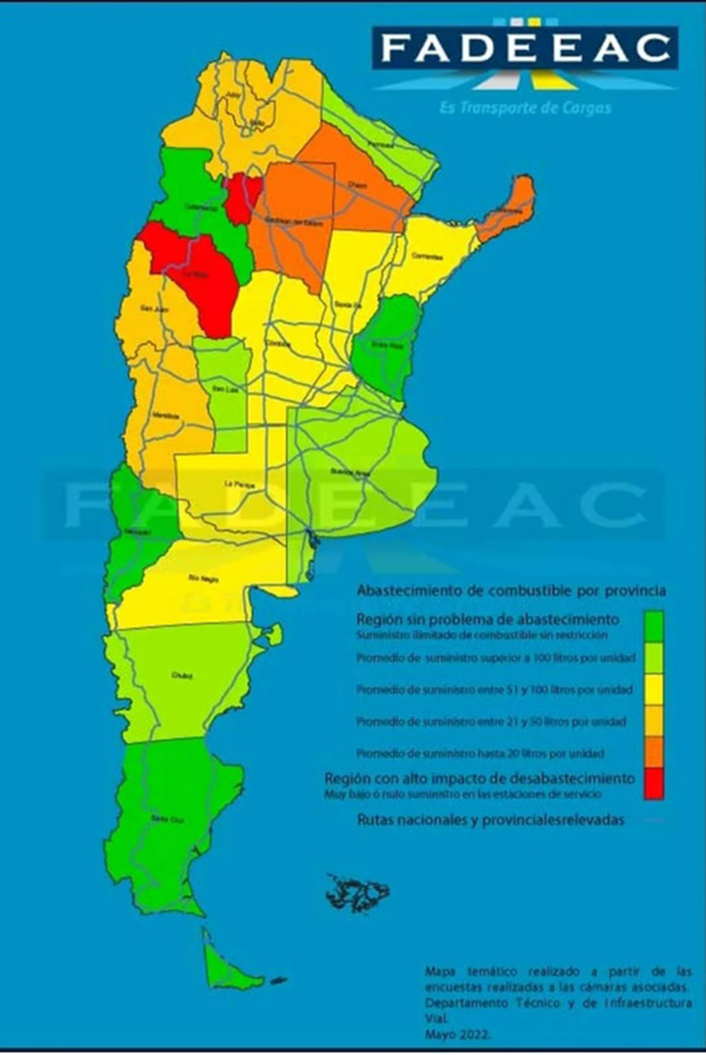 A fin de colaborar con los asociados en la advertencia de las provincias donde resultará imposible, difícil o fácil la recarga de gasoil y otros combustibles, la Federación Argentina de Entidades Empresarias del Autotransporte de Cargas (Fadeeac) realizó un relevamiento y, con los resultados, emitió un mapa con seis colores: rojo (donde se evidencia del desabastecimiento), naranja oscuro (con suministro de hasta 20 litros por unidad); naranja claro (con suministro de 21 a 50 litros por unidad); amarillo (se consiguen de 51 a 100 litros por unidad); verde claro (más de 100 litros por unidad); y verde oscuro (sin problemas de desabastecimiento).