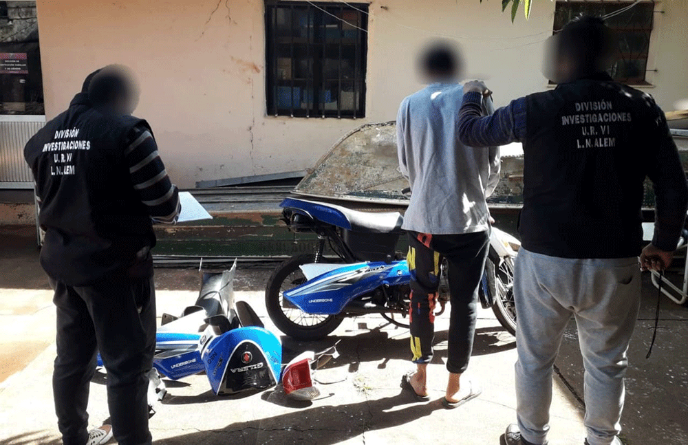 El primer hallazgo tuvo lugar en el barrio Juan Pablo ll de Alem, donde integrantes de la División de Investigaciones de la UR-VI encontraron partes de una motocicleta que había sido robada. Una patente, plásticos, el cuadro y el carenado del rodado fueron los objetos que aparecieron entre las malezas. Por el hecho, detuvieron a un joven de 21 años señalado como autor del delito.