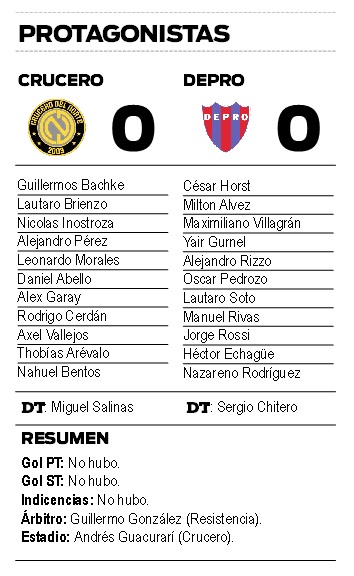 Nadie puede discutir que Crucero del Norte no hizo todo lo posible para quedarse con los tres puntos. Fue el amplio dominador frente a Depro, por la fecha 10 del Torneo Federal A, pero falló en la definición y se tuvo que conformar con un 0-0, que dejó un sabor amargo porque significó volver a dejar puntos en el camino.