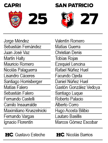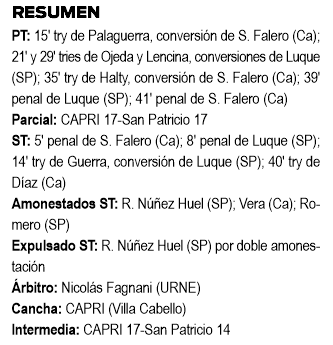 A esa altura, San Patricio se mostraba más entero en el scrum (CAPRI sintió la ausencia de dos de sus pilares titulares, Echeverría y Quiñones) y con esa fuente de obtención armó una jugada que terminó con el hooker Matías Guerra apoyando un nuevo try, a los 14 para dejar al “Santo” arriba 27-20.