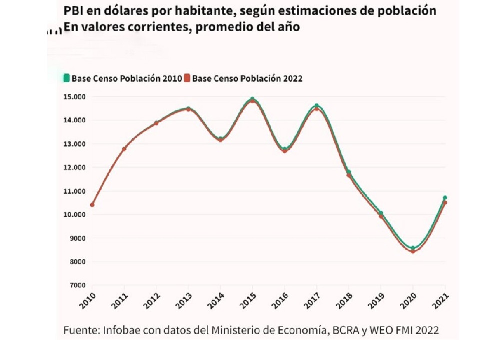 En el caso del PBI, el Ministerio de Economía estimó para el promedio de 2021 un nivel de USD 491.000 millones, al tipo de cambio oficial, equivalente a USD 10.506 por habitante, según la nueva estimación de población para la media de ese año de 46,74 millones de personas. Con los datos previos se calculaba en 10.721 dólares.