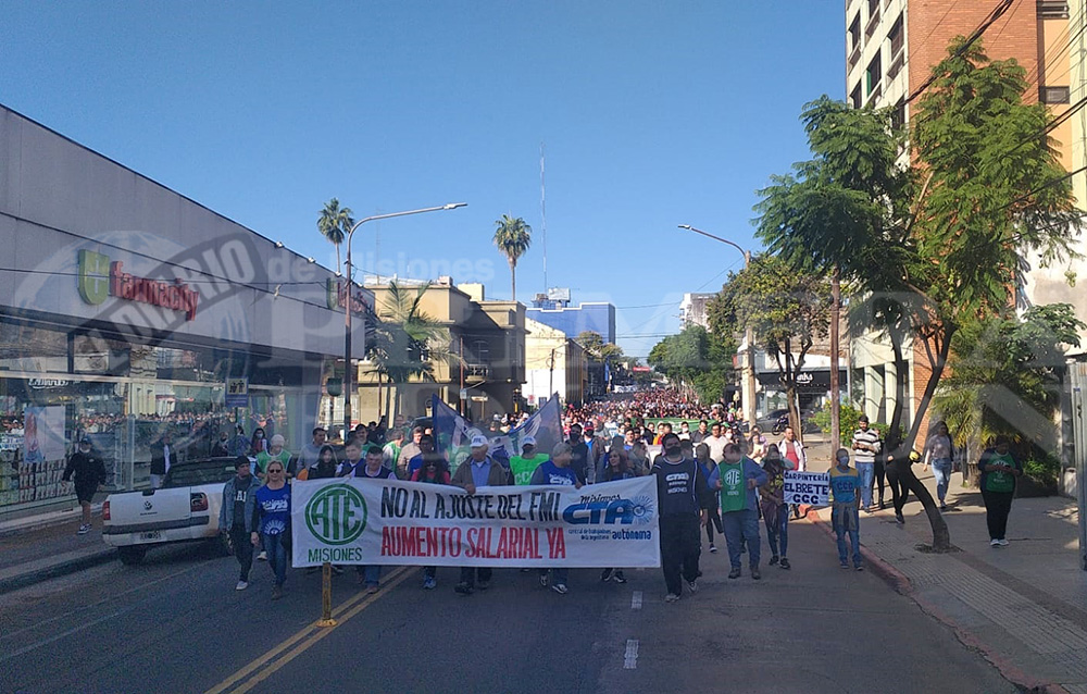 Una nueva jornada de manifestaciones y reclamos copó esta mañana las calles céntricas de Posadas. En el marco del paro nacional convocado por la CTA Autónoma, desde las 8.30 de este martes, cientos de trabajadores pertenecientes a la CTA y ATE, además de organizaciones sociales como la CCC (Corriente Clasista y Combativa) y el Polo Obrero, se concentraron en el mástil de la avenida Mitre y Uruguay.