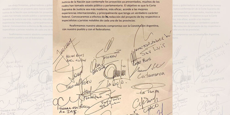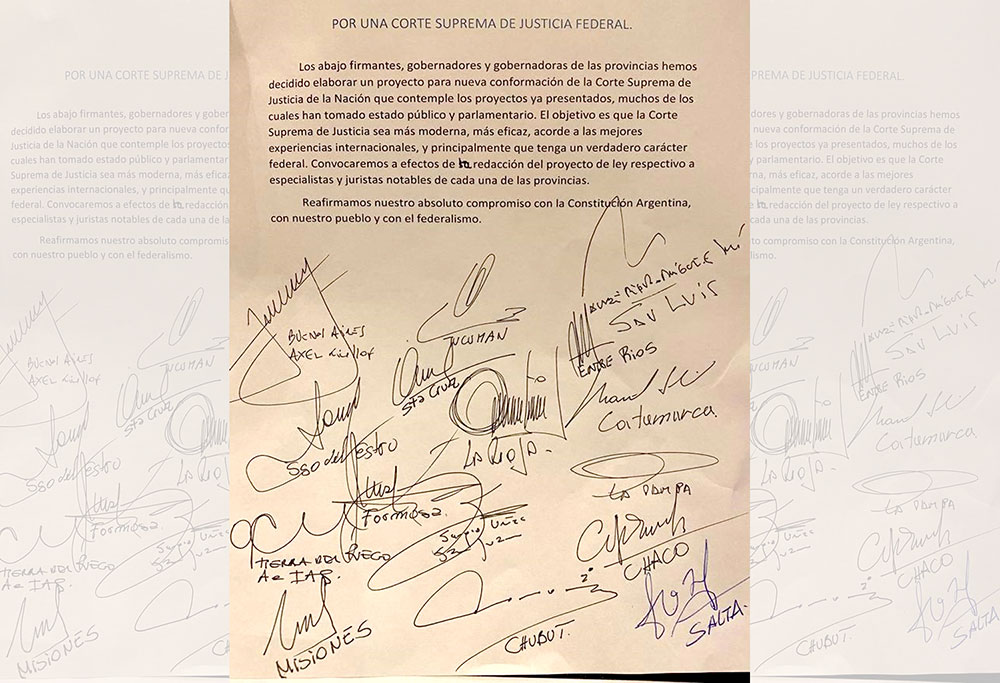 El texto indica: “Los abajo firmantes, gobernadores y gobernadoras de las provincias, hemos decidido elaborar un proyecto para nueva conformación de la Corte Suprema de Justicia de la Nación que contemple los proyectos ya presentados, muchos de los cuales han tomado estado público y parlamentario”.