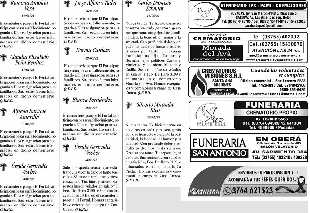 Fúnebres del Miércoles 25 de Mayo de 2022