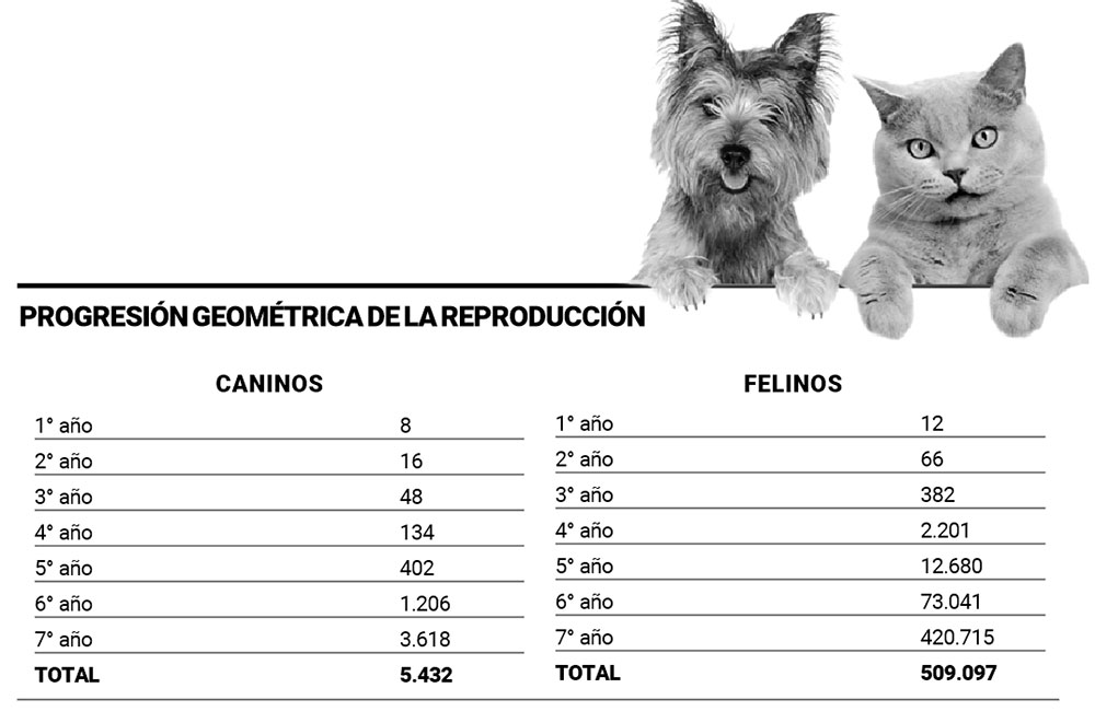 De acuerdo a las estadísticas, la progresión de nacimiento es exponencial y sólo se resuelve trabajando antes del problema. Un dato para tener en cuenta 5.432 es el total de perros/as procreados por una hembra y su descendencia en 7 años y 509.097 es el total de gatos/as procreados por una hembra y su descendencia en el mismo período de tiempo.
