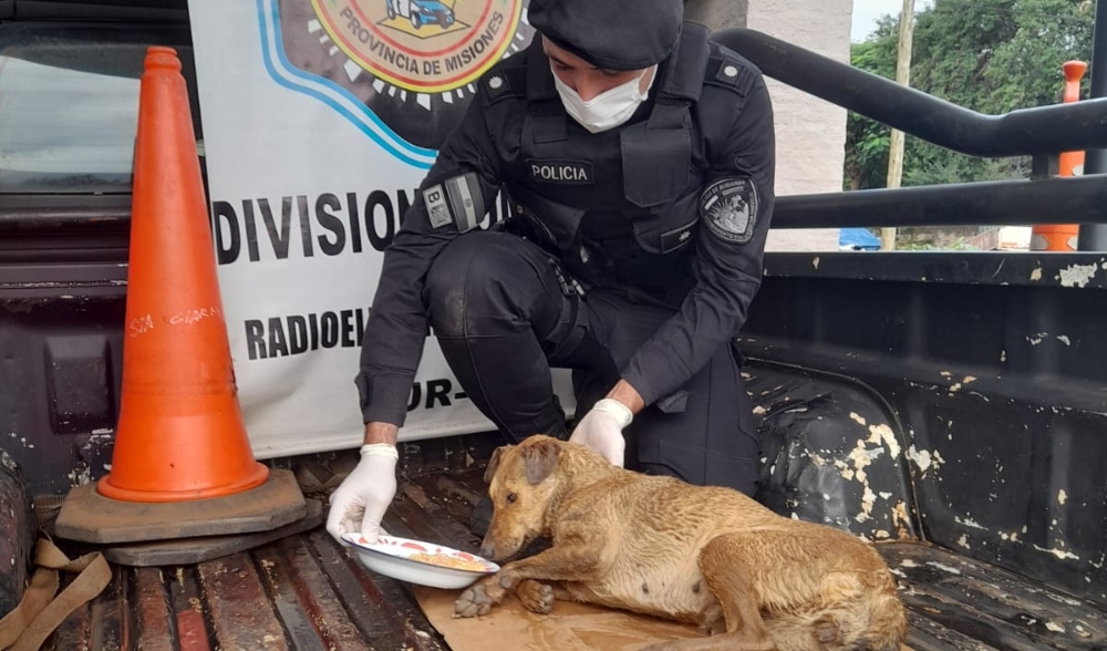 Esta tarde en el barrio Nueva Garupá, entre las calles Loreto y Campo Grande, los efectivos de la División Comando Radioeléctrico Santa Clara rescataron de una alcantarilla a una perra de raza mestiza.