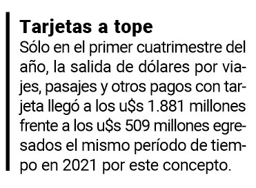 Sólo en el primer cuatrimestre del año, la salida de dólares por viajes, pasajes y otros pagos con tarjeta llegó a los 1.881 millones de dólares frente a los 509 millones de dólares egresados el mismo período de tiempo hace un año por este concepto.