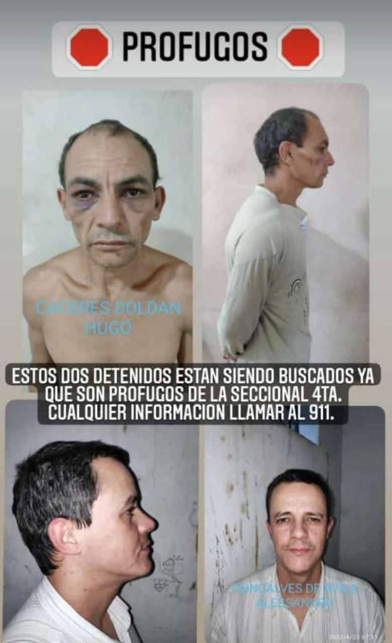 Una vez controlada la situación con apoyo de Infantería, se requisaron las celdas y se estableció la fuga de dos de los 13 detenidos allí alojados, quienes fueron identificados como Cáceres Doldan de nacionalidad paraguaya y el brasileño Alessandro Goncalvez de Avila.