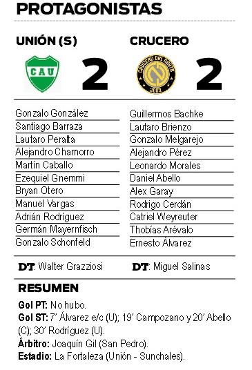 En un partido parejo de trámite cambiante, Crucero del Norte igualó 2-2 con Unión de Sunchales, por la fecha 11 del Torneo Federal A, y si bien continúa sin poder ganar, todavía se mantiene en los puestos altos de la Zona 2.