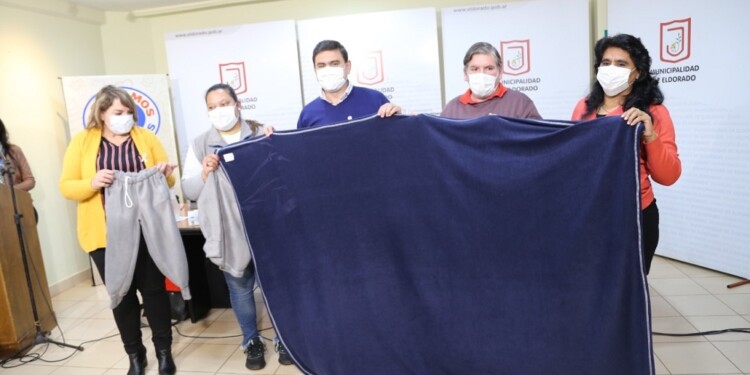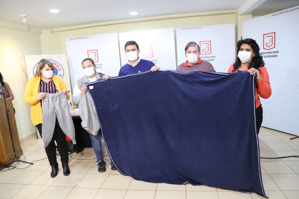 La tela con la que se confeccionan las prendas para los niños y las mantas fue donada en parte por vecinos, comerciantes y la Municipalidad de Eldorado. “Si bien se arman prendas con pantalones y buzos, con los retazos se confeccionan cuellitos, boinas y otras ropas más pequeñas”.