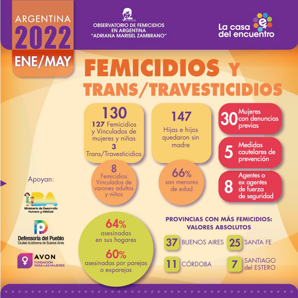 En los primeros cinco meses de 2022 se registraron en el país 127 femicidios y vinculados de mujeres y niñas, 3 trans/travesticidios y 8 femicidios vinculados de varones.