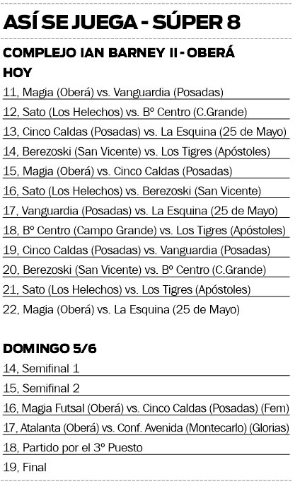 Con la participación de ocho equipos de toda la provincia, se pondrá en marcha hoy la segunda edición del Torneo Súper 8 de futsal, organizado por el Club Magia de Oberá. La cita comenzará a las 11 y se disputará íntegramente en el Complejo Ian Barney II de la Capital del Monte.