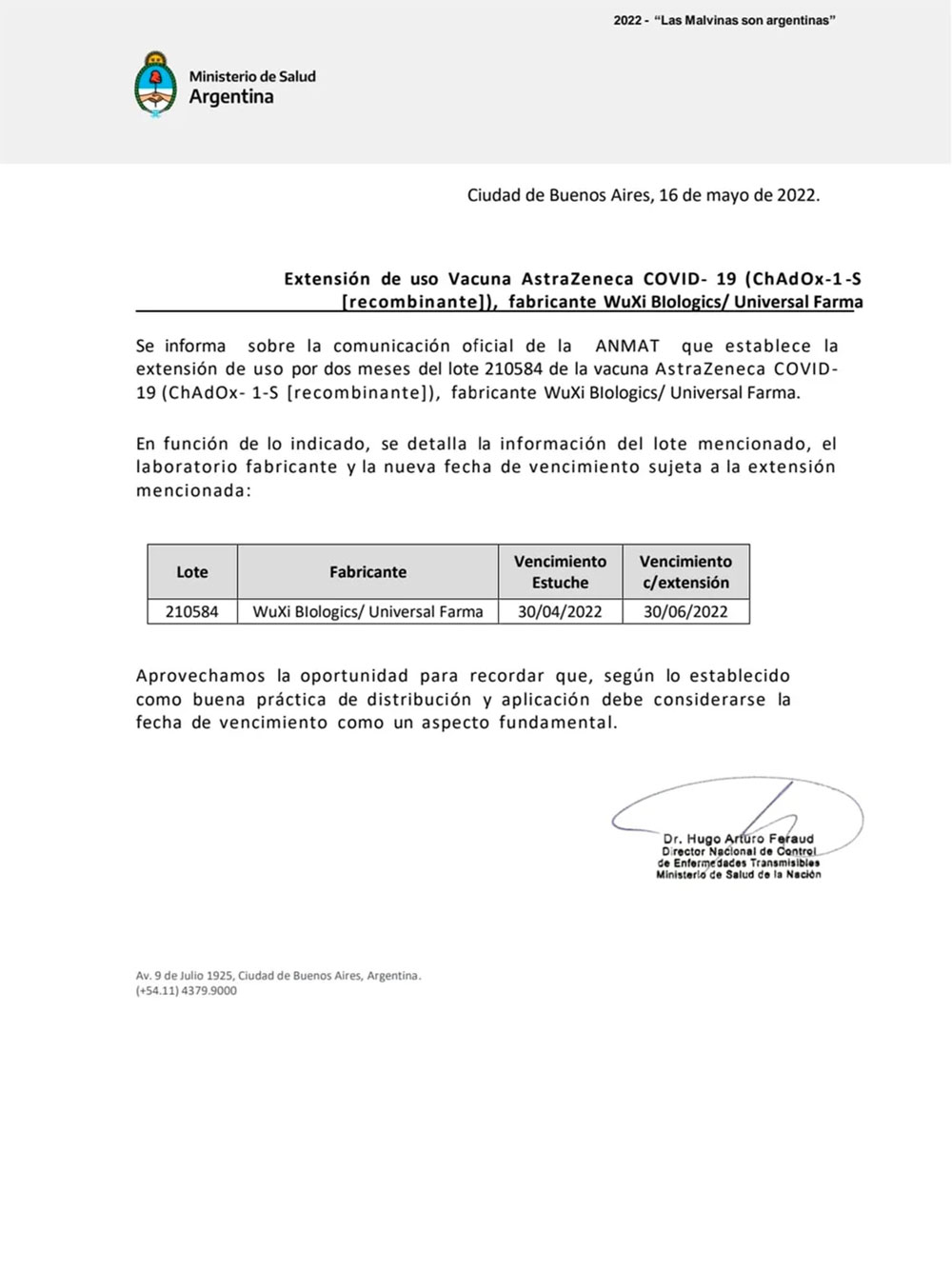 Debajo del detalle sobre el lote de fármacos, el comunicado oficial especifica que “según lo establecido como buena práctica de distribución y aplicación, debe considerarse la fecha de vencimiento como un aspecto fundamental”. El documento está firmado por Hugo Arturo Feraud, Director Nacional de Control de Enfermedades Transmisibles del Ministerio de Salud de la Nación.