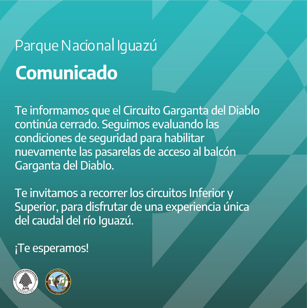 La Administración del Parque Nacional Iguazú informó este sábado que el Circuito Garganta del Diablo continuará cerrado al público durante las próximas horas.