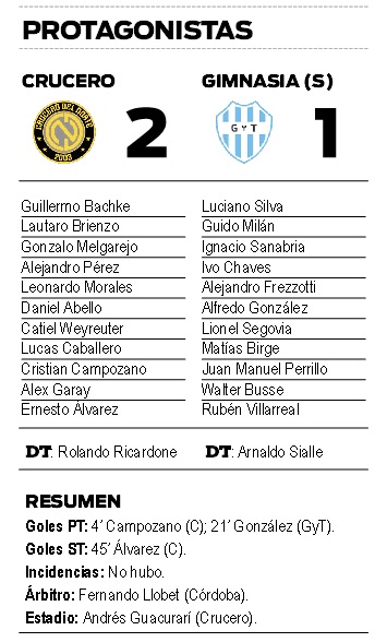 No fue el mejor partido de Crucero del Norte, pero este sábado venció por 2-1, sobre la hora, a Gimnasia y Tiro de Salta y logró quebrar esa racha adversa de cuatro partidos sin ganar en el Torneo Federal A. La era Ricardone comenzó con un triunfo y hoy su equipo está, al menos transitoriamente, en la punta.