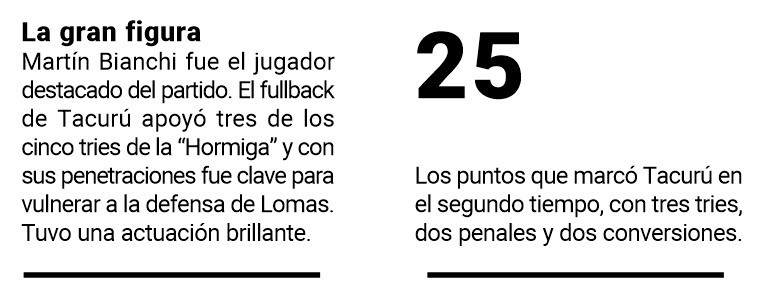 Tacurú comenzó a dominar el scrum, incluso generó un try penal luego de que el rival no aguantara esa formación en cinco yardas y así fue construyendo su gran victoria, que se sustentó con dos tries del fullback Martín Bianchi, más dos penales de Litviñuk para cerrar el marcador final en 39-25.