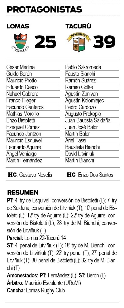 En ese contexto, Lomas se puso en ventaja a los 4 minutos con un try de Mauricio Esquivel y Tacurú respondió a los 7 con un ensayo de Juan Bautista Saldaña.