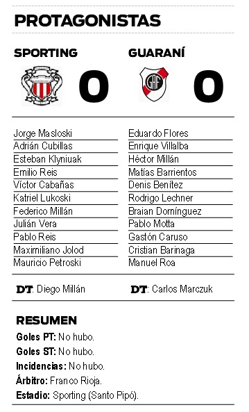 Kevin Klyniauk fue de lo más peligroso en el conjunto que conduce Diego Millán y tuvo dos buenas chances para marcar. La Franja, en tanto, pudo marcar a través de Gastón Caruso, que tuvo el gol en sus pies en dos oportunidades. Cristian Barinaga también pudo poner el 1-0, pero Sporting salvó en dos tiempos, primero con la atajada de Maslovski y luego con el despeje de Vera en la línea.