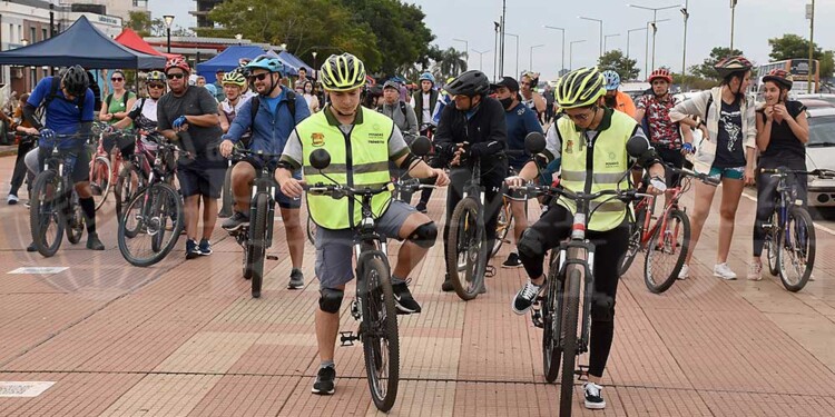 Un numeroso grupo de ciclistas se sumó a la convocatoria ayer en el cuarto tramo de la costanera. El punto final fue frente al Monumento de Andrés Guacurarí.