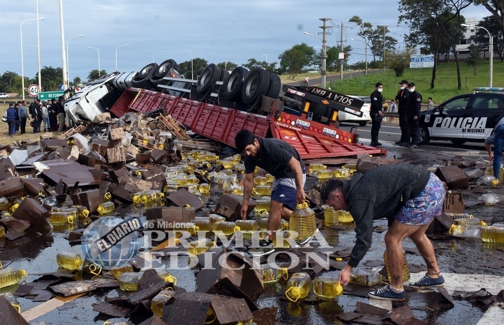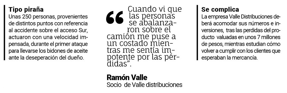Y remarcó: “Lo que fue pérdida por la desintegración de los packs y luego todo lo que la gente se llevó, no se recupera”. Durante el accidente se perdió el 50% de la carga.