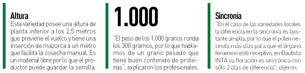 Por otro lado, los profesionales explicaron que “Bautista INTA posee una mazorca con 16 hileras de granos grandes y una buena cobertura de chala que evita su pudrición por altas precipitaciones o el ataque frecuente de plagas”.