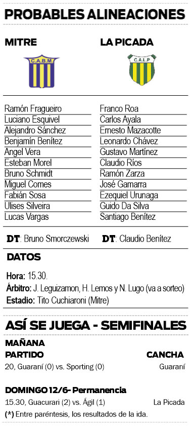Uno de los habituales animadores de las instancias finales del torneo local, Bartolomé Mitre enfrentará esta tarde, desde las 15.30 a Atlético La Picada con la obligación de ganar por al menos dos goles de diferencia, para así forzar la definición desde el punto del penal. Será un encuentro clave en su camino por la clasificación al torneo Regional Federal Amateur.