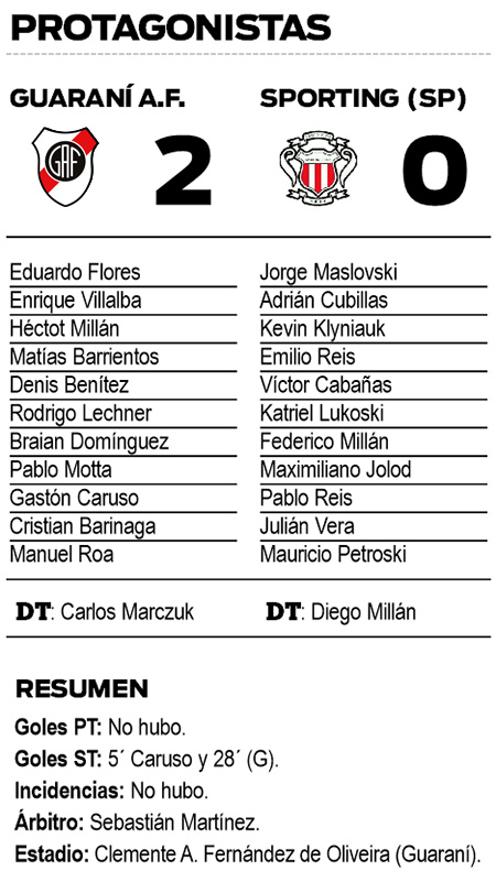 Guaraní levantó considerablemente y tuvo otras dos claras en los pies de Caruso, que falló en la definición. Sin embargo, a los 28’, entró en acción el capitán Barinaga y no falló. Recibió una pelota de Almirón y definió por encima del cuerpo del arquero para el 2-0.
