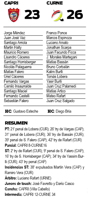 Los minutos finales tuvieron a CAPRI buscando desesperadamente achicar, algo que logró a los 43 con un try penal luego de un scrum que CURNE no pudo aguantar.